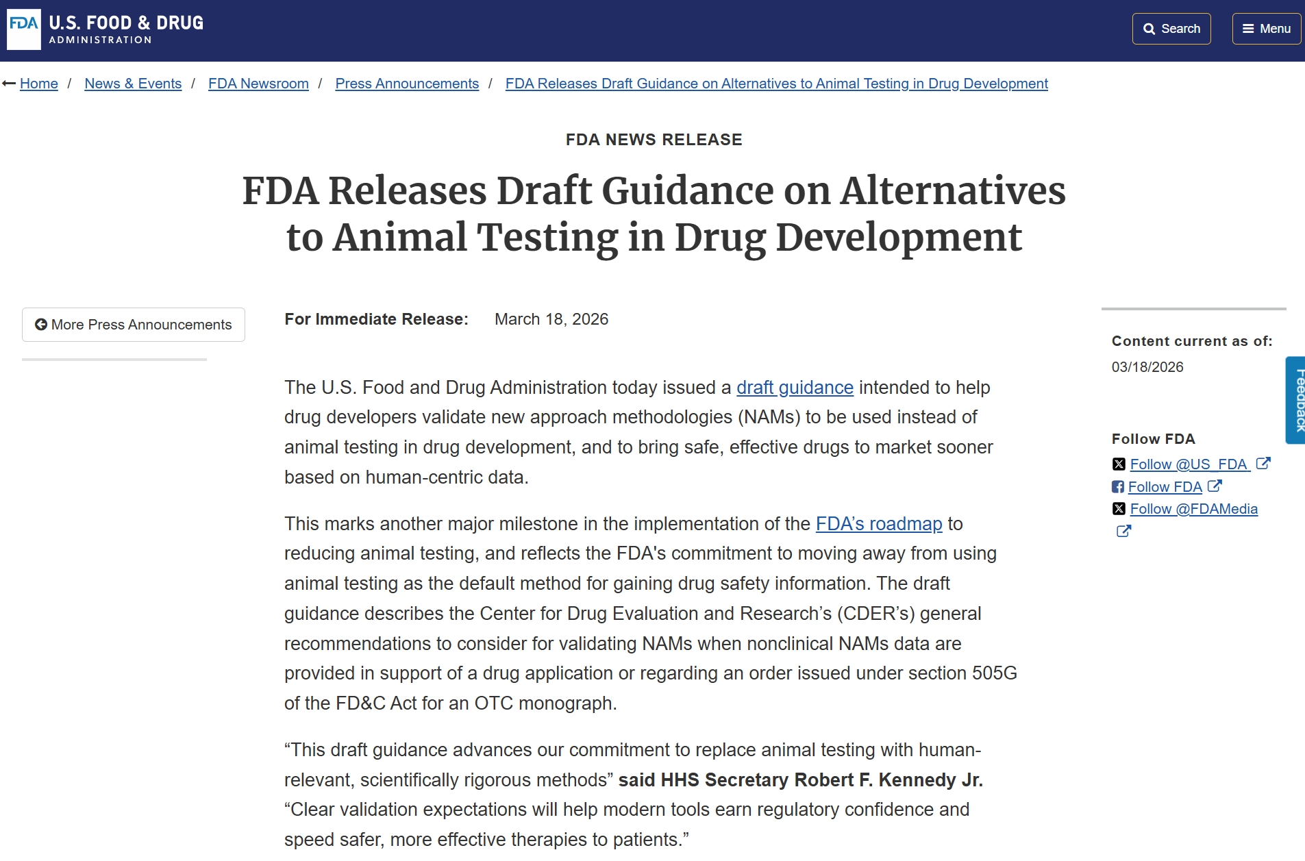 自2022年FDA现代化法案2.0获批起,“替代动物实验”的监管策略持续推进。今年3月中旬,FDA正式发文,开始接受非动物数据用于新药评审,鼓励采用类器官/器官芯片、AI毒理学模型等新方法学(NAMs),以逐步降低药企对动物实验的依赖。