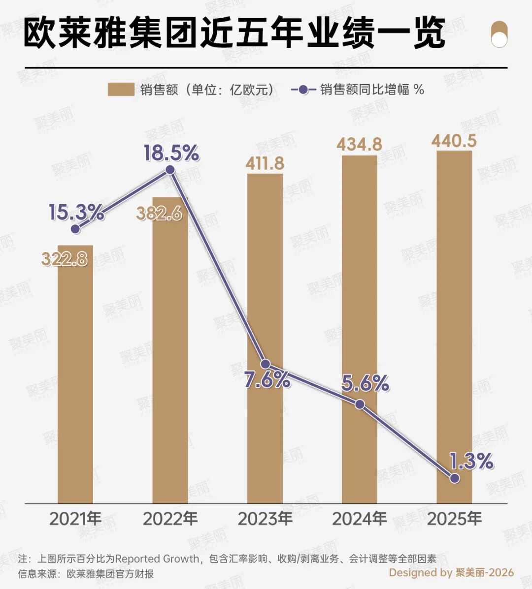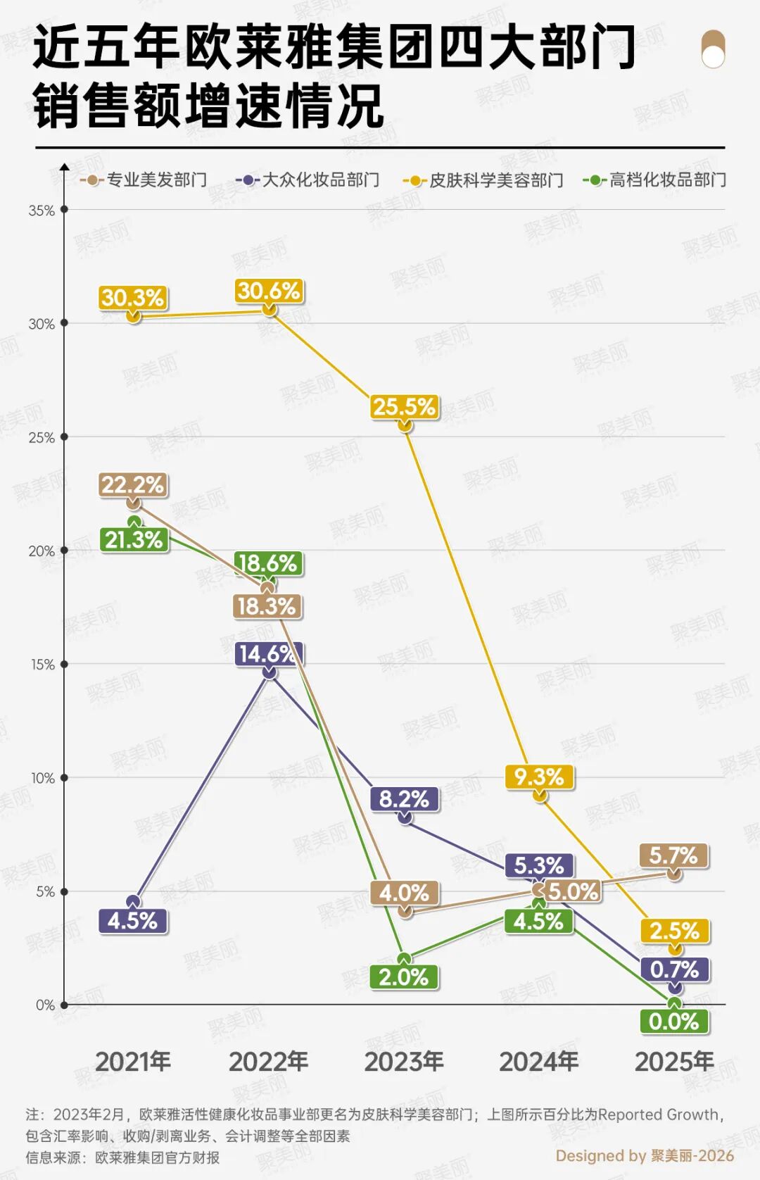这一任命不难理解。Stijn Demeersseman负责的大众化妆品部门近年增速放缓。2021-2025年,欧莱雅四大部门从双位数增长降至低个位数微增,增幅大幅放缓。其中大众化妆品部门2021年增长4.5%,2022年达14.6%后连续三年下降,2025年仅微增0.7%,增速在四大部门中排倒数第二。