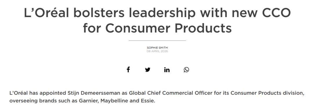 Stijn Demeersseman在LinkedIn上表示:“我很自豪能以CCO身份重返欧莱雅,荣幸加入这家持续在创新、品牌建设和规模化执行方面树立标杆的公司。”