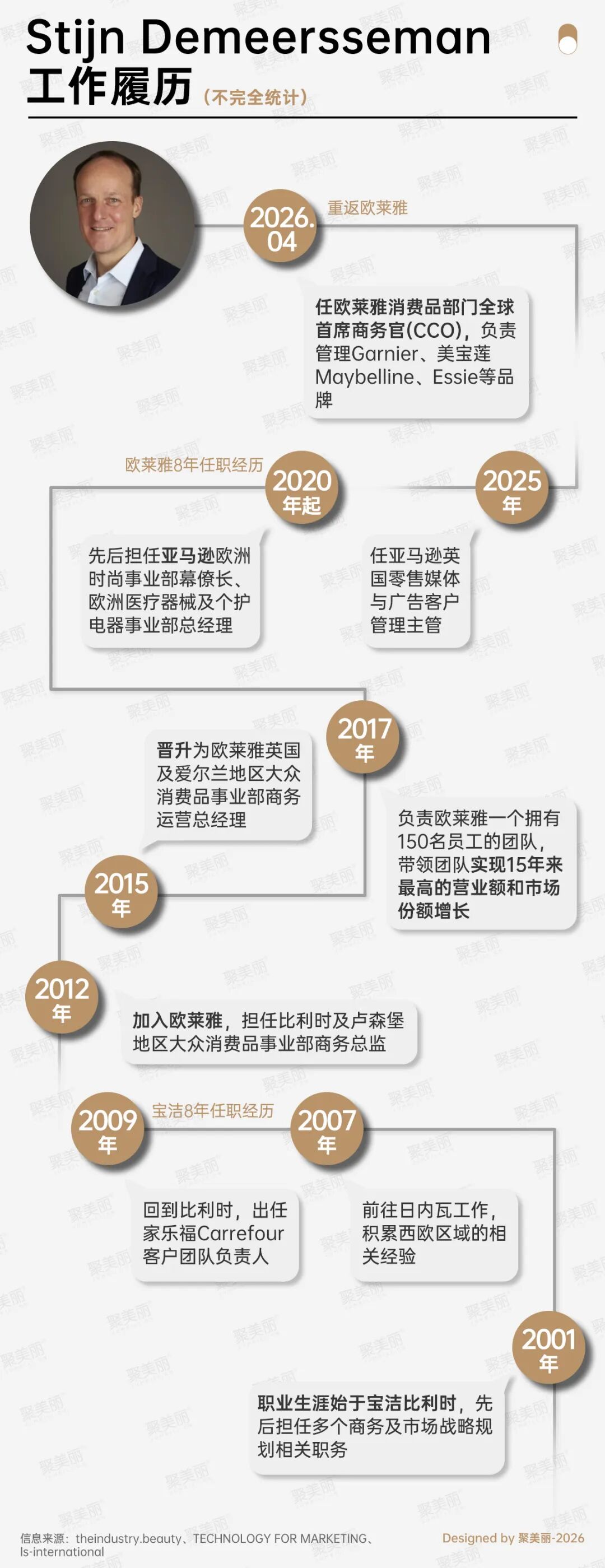 欧莱雅对Stijn Demeersseman的任命寄予厚望。他的回归并非简单补位,而是以“宝洁体系+欧莱雅基因+亚马逊数字化”的复合能力应对挑战,正如他所说,“助力推进欧莱雅全球‘美容民主化’战略使命”。