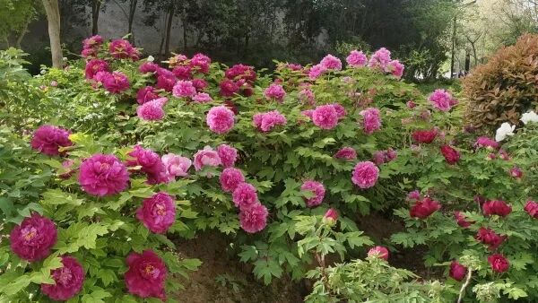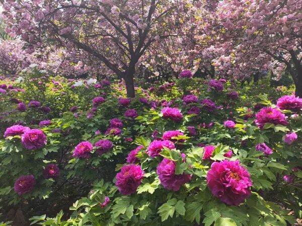 隋唐城遗址植物园:全园约450个牡丹品种绽放,主要集中在九色园、特色园、百花园、科技园。盛开品种有蓝宝石、百花娇艳、大红剪绒、锦袍红、玉面桃花等;初开品种包括朝衣、胡红、赛丽花、雨后风光、赛墨莲等。园内绣球荚蒾、荷包牡丹、黄馨、菊花桃、猬实等也竞相开放。