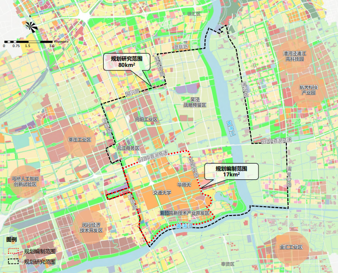 从图中可清晰看到,闵行紫竹片区的颜色与莘庄(外环以外部分)等区域一致,基准价格高于周边区域,直观反映了该区域的土地价值。闵行紫竹滨江沿岸重点板块的基准地价等级提升,也符合规划导向与实际发展需求。
