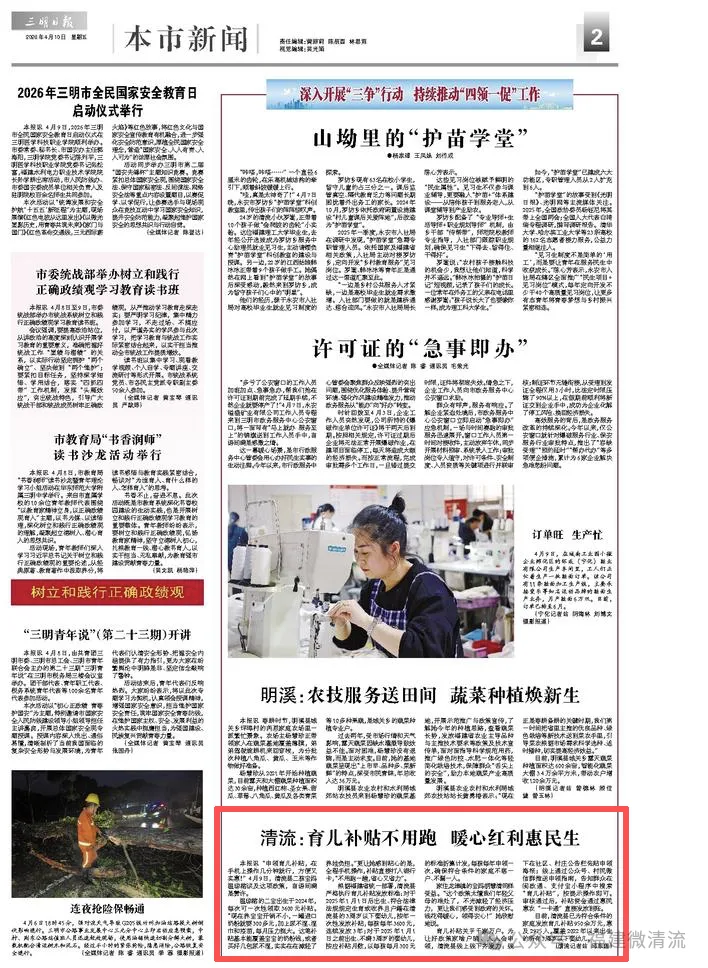 原标题:《【三明日报】清流:育儿补贴不用跑 暖心红利惠民生》