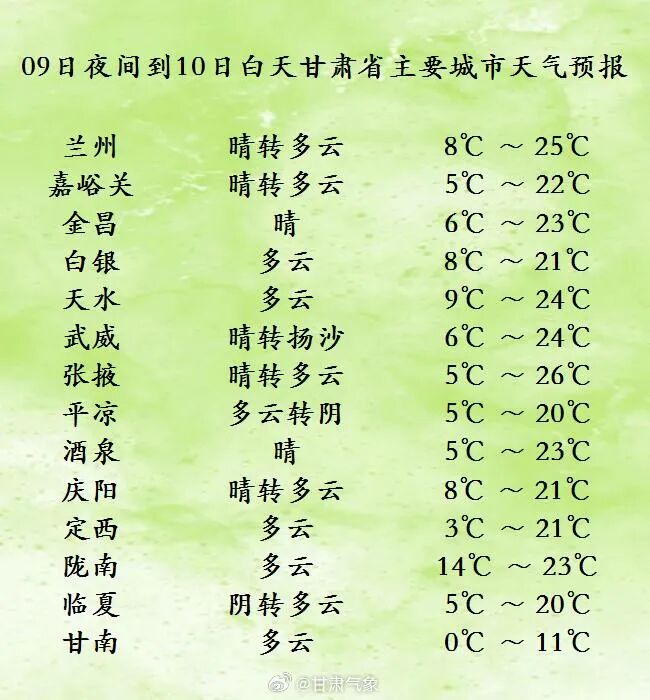 4月10日20时至4月11日20时(今天夜间到明天白天),甘南、定西、陇南、天水、平凉等市州天气以多云为主,部分地方有小雨或雨夹雪;省内其他地区则为晴或多云。同时,河西五市以及白银市北部、兰州市北部将有4-5级西北风,局部区域可能出现沙尘。