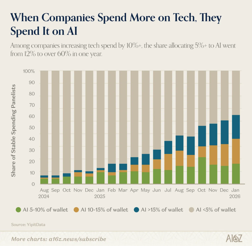 在技术支出增长超10%的企业中,AI的预算占比正快速提升。
