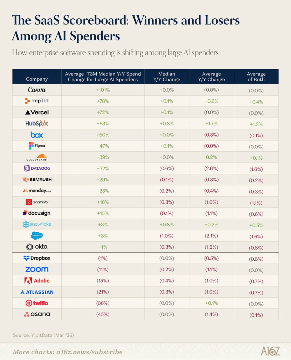以CRM SaaS为例,HubSpot在AI支出较多的企业中采购额增长63%,而行业老大哥Salesforce仅增长3%;设计SaaS领域,Canva增长101%,Adobe却下降15%。