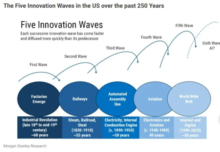 大摩指出,AI并非孤立现象。审视这五次浪潮,会发现历史正在重演:
