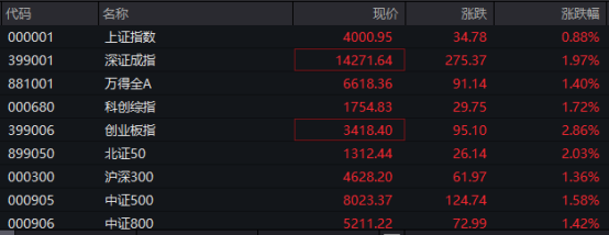 深证成指同样表现强劲,盘中突破14000点整数关口,涨幅超2%。
