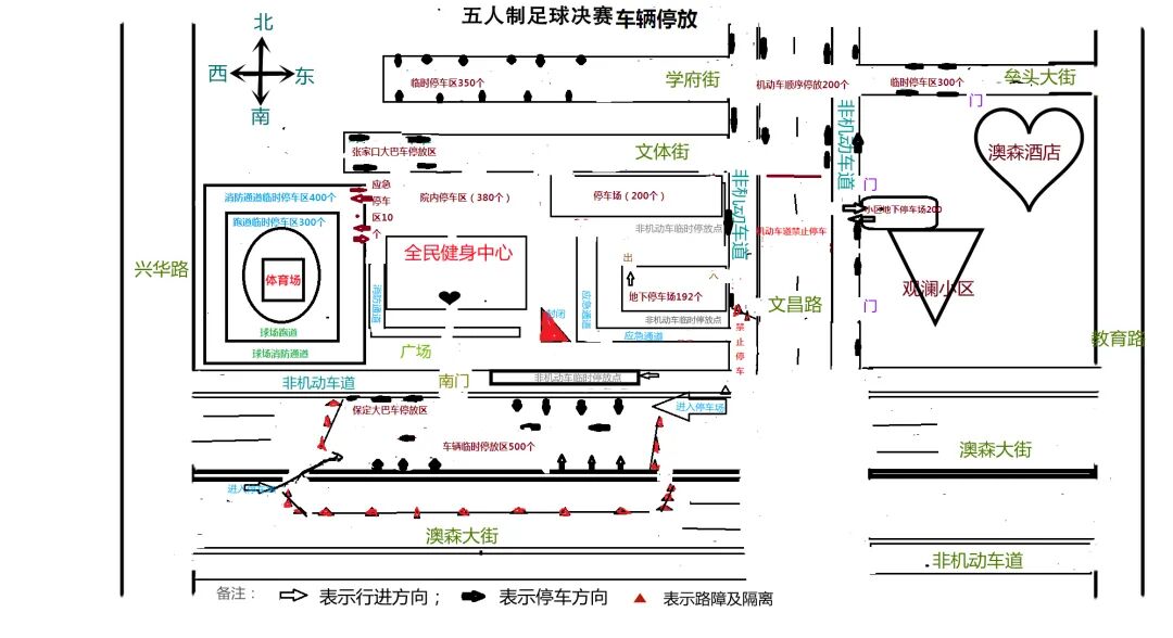 免费停车方面,赛事期间3000余个配套停车位全部免费开放。A区、D区、V区观众需从南广场入场,建议将车辆停放在澳森大街北半幅机动车道临时停车区;B区、C区及无障碍观赛区观众需从北广场入场,建议停放至澳森全民健身中心北广场、澳森商业中心北停车场或学府街(文昌路至学府街小学段)临时停车区;大巴车可停在文体街西侧。此外,澳森全民健身中心西侧体育场、澳森商业广场地下停车场同步免费开放,学府街、文体街、垒头大街、文昌路等区域也设为临时停车区,具体请参考停车点位示意图↓↓↓