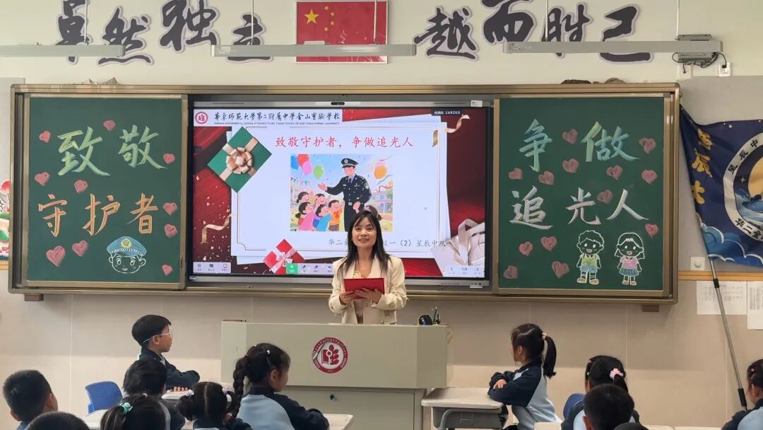 校方联系金山公安找到庄智源,促成了主题为“致敬守护者,争做追光人”的微班会。汤芸熙分享了校服失而复得的经历,将手绘感谢信送到庄智源手中。