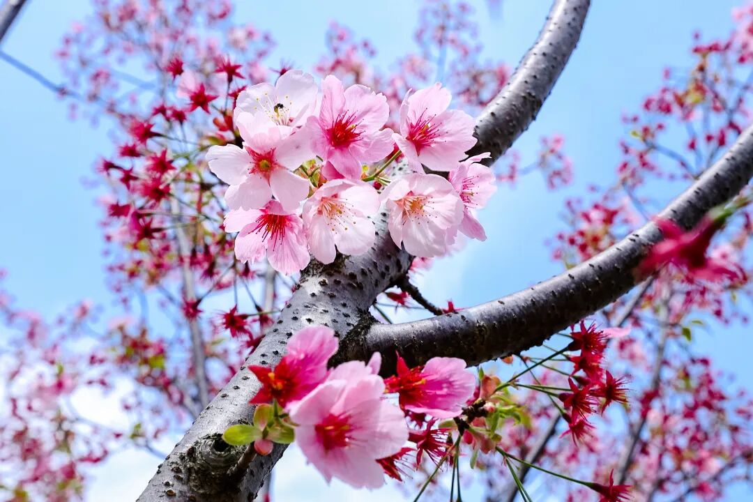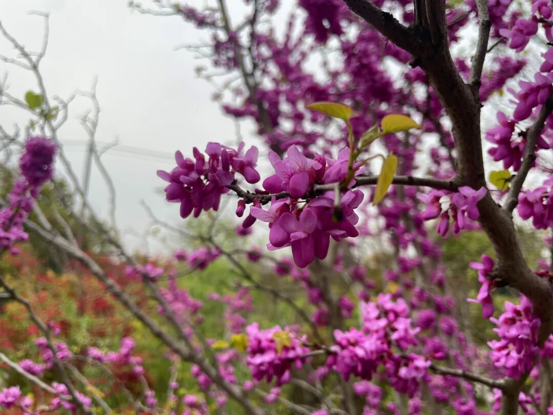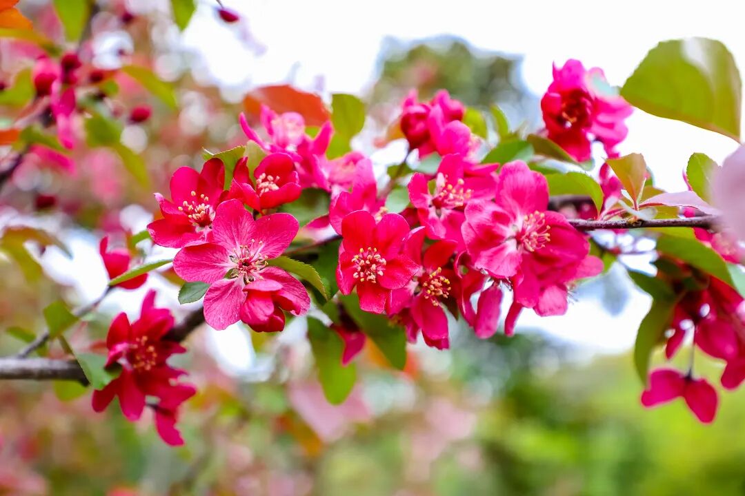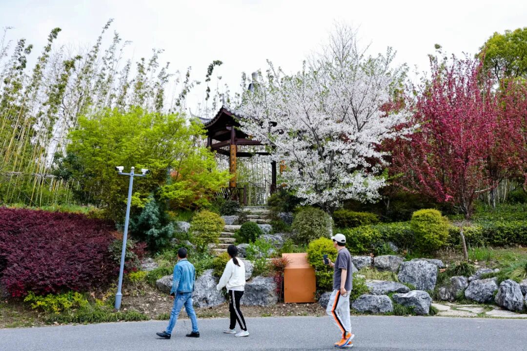 它们并非含蓄地舒展,而是一簇簇、一片片热热闹闹地铺满枝头。梅花尚未完全凋零,樱花就已接续盛开;樱花刚随风飘落,垂丝海棠又缀满了粉色花串。红、粉、白、紫等色彩交织,将59.7公顷的园区晕染得绚烂多彩。