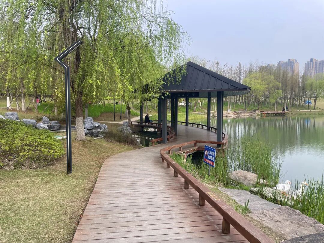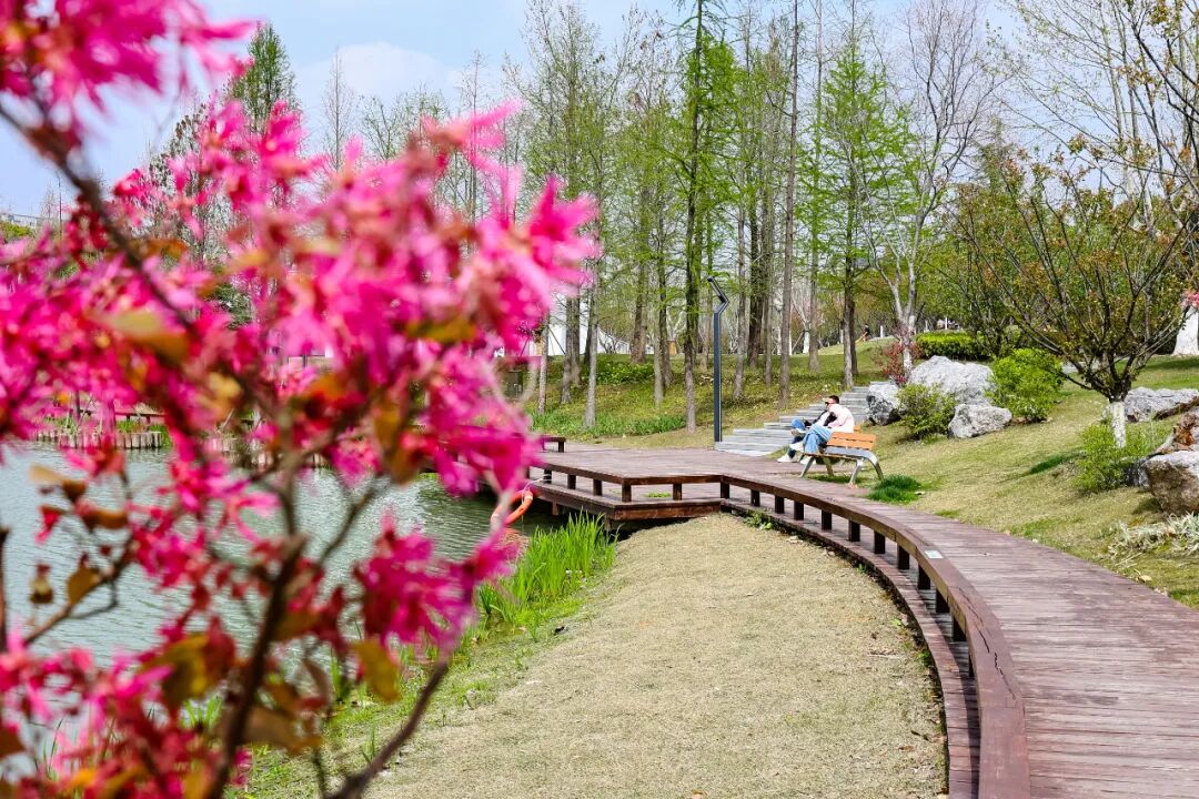 漫步亲水平台与水岸栈道,累了便坐在湖边红船上,看水波荡漾、鸟儿掠过水面、花瓣飘落。