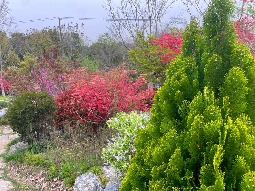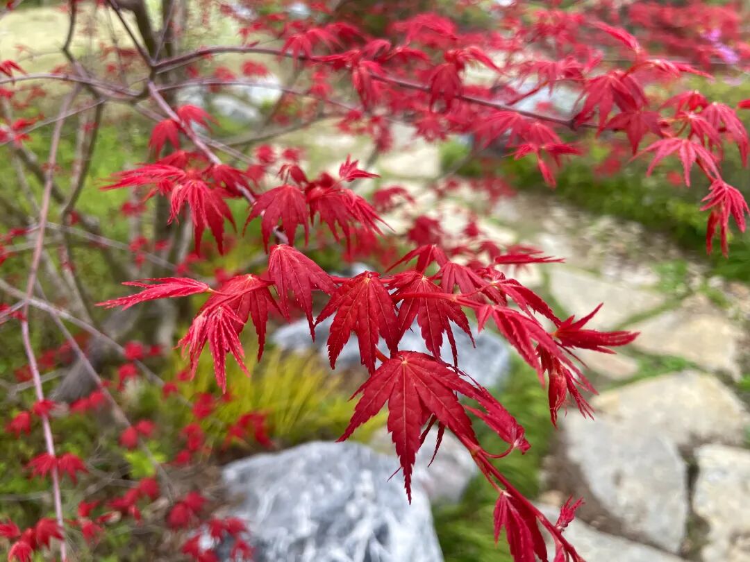 红舞姬枫树是园内最亮眼的“点缀”,叶片红得纯粹热烈,在粉白花海中格外醒目。阳光穿透枫叶,在地面投下斑驳红影,如同一幅流动的油画。