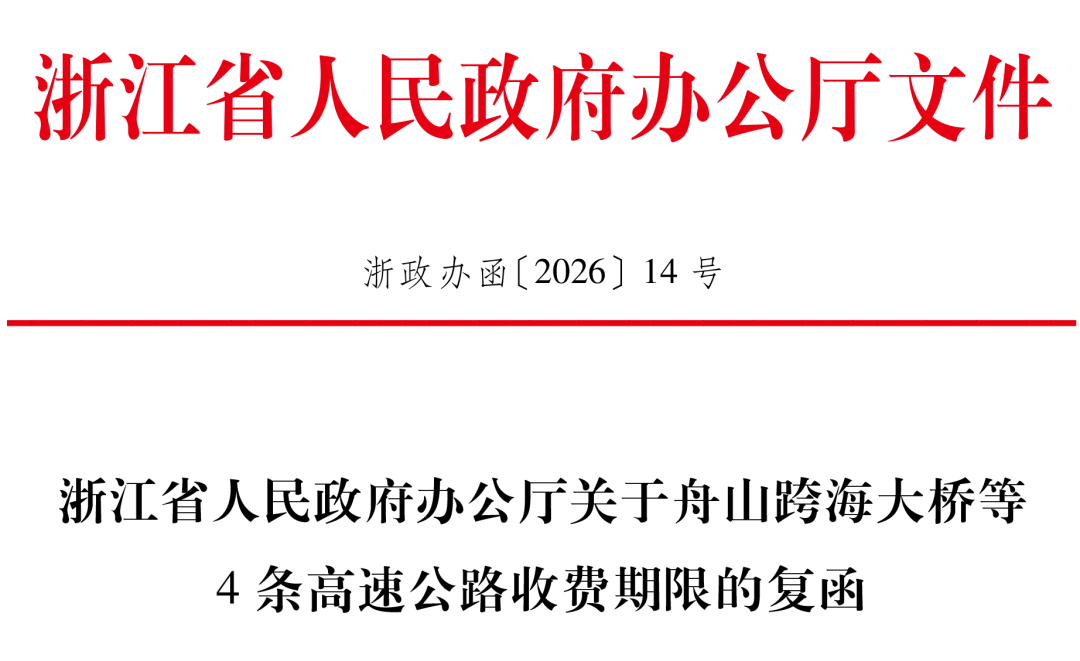 近日,浙江省政府办公厅就《宁波市人民政府关于提前取消宁波市高速公路江北连接线收费项目并停止合并收费的请示》《浙江省交通投资集团有限公司关于核定舟山跨海大桥等高速公路收费期限的请示》作出复函。