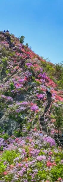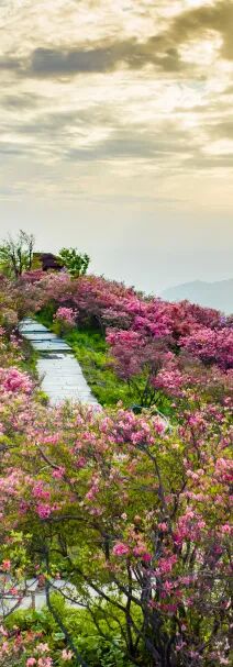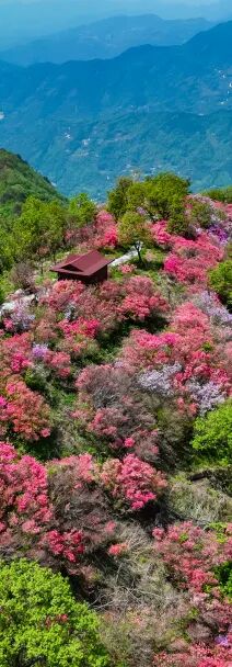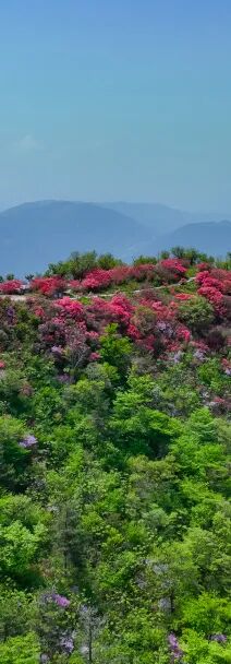 想邂逅五彩杜鹃,就来天马寨。每年四月,红、黄、紫、白、粉五种颜色的杜鹃沿着海拔近1100米的山脉依次绽放,为翠绿群山披上绵延十里的“五彩丝带”。