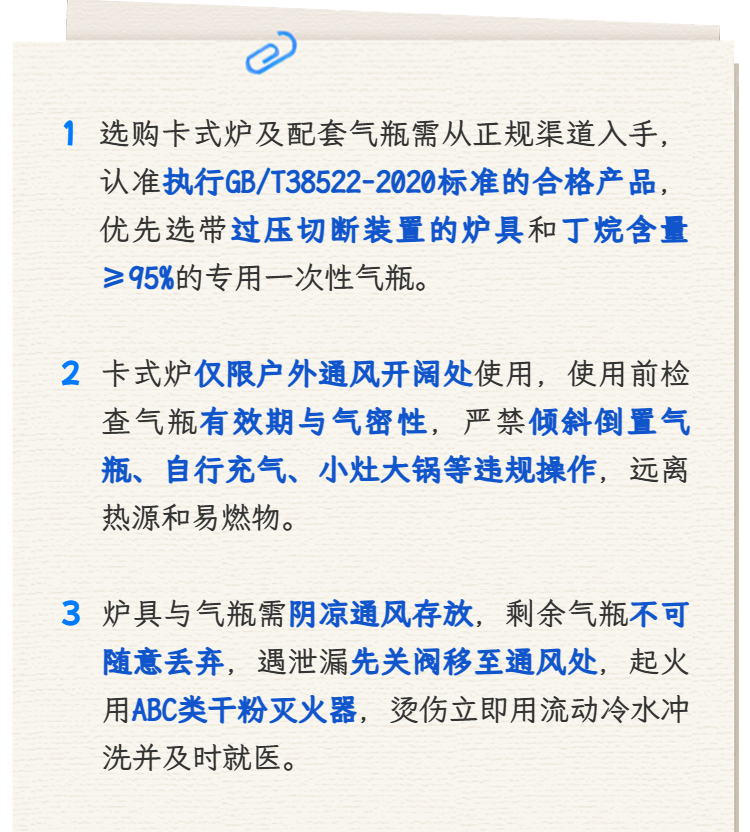 露营前请确认营地是否允许使用明火,使用卡式炉时做好防护。如发现产品质量问题,可向市场监管部门投诉举报,维护自身权益。