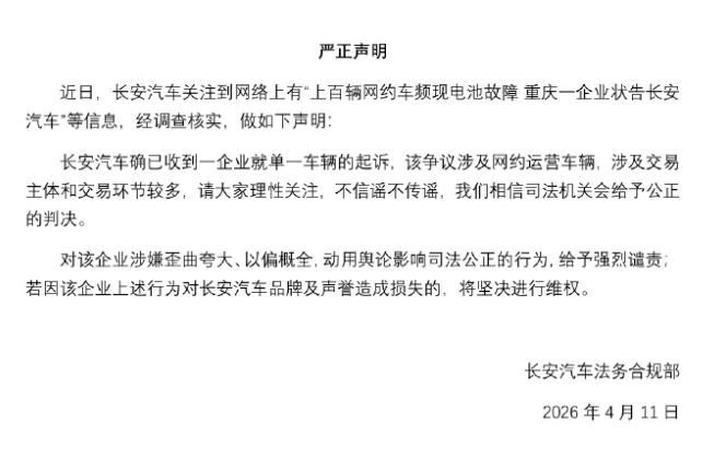 长安汽车就“上百辆网约车电池故障被起诉”事件发布声明