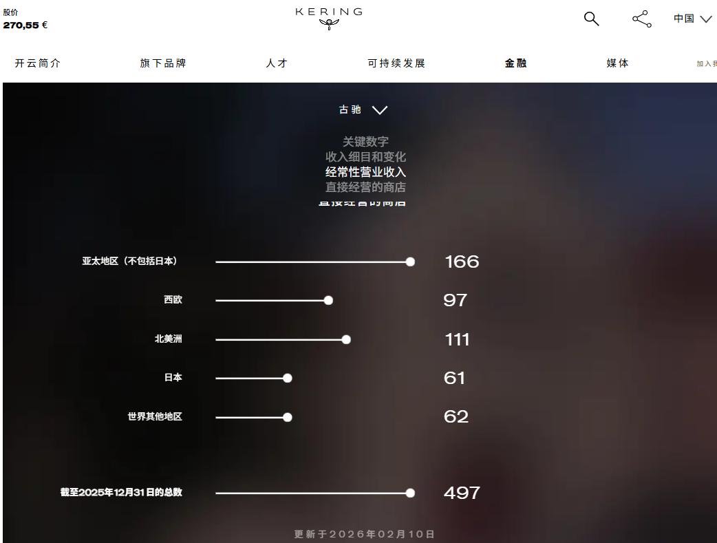 截至2月10日,GUCCI全球门店数为497家。其中,亚太地区(不含日本)共有166家,占比超3成,是GUCCI全球门店数最多的区域。