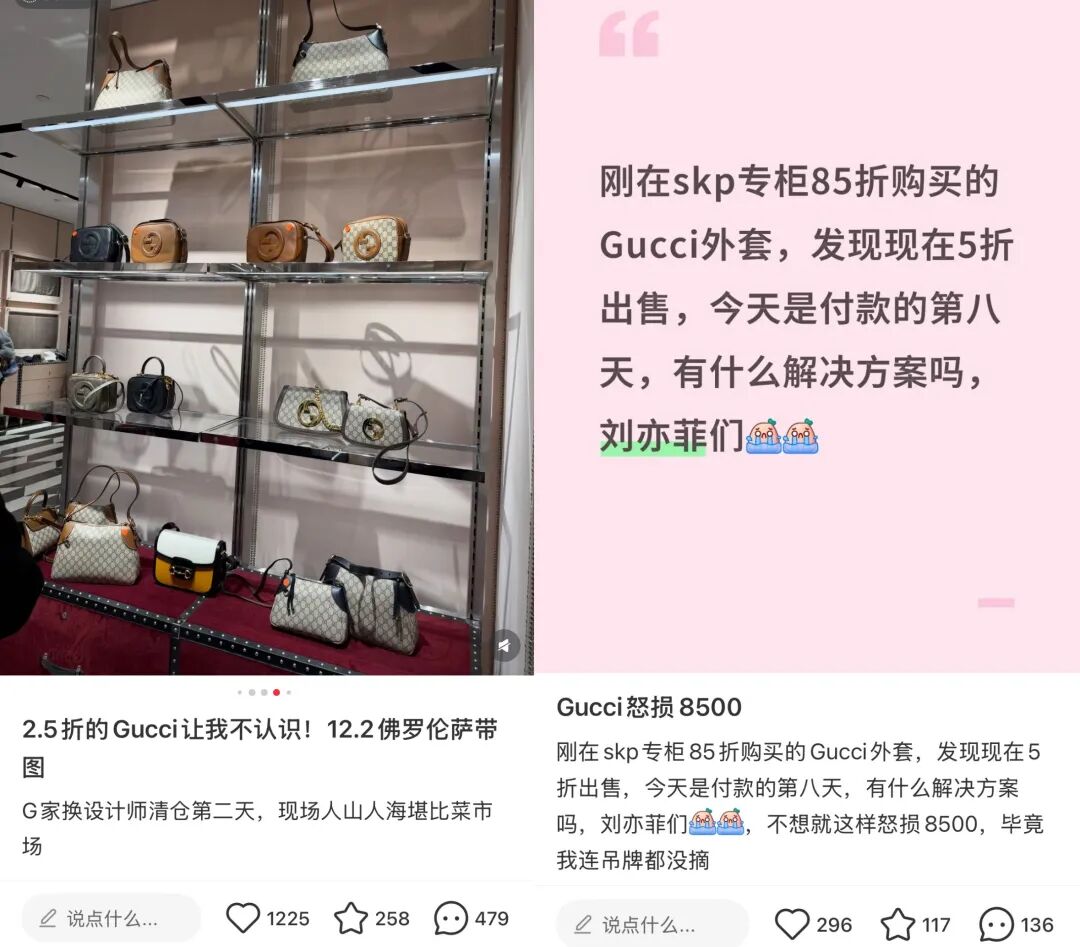 在小红书平台,除了网友惊叹GUCCI的2.5折高折扣,还有人求助:“专柜买回来的GUCCI外套,还没拆吊牌就进奥莱,损失的8500元该怎么办?”