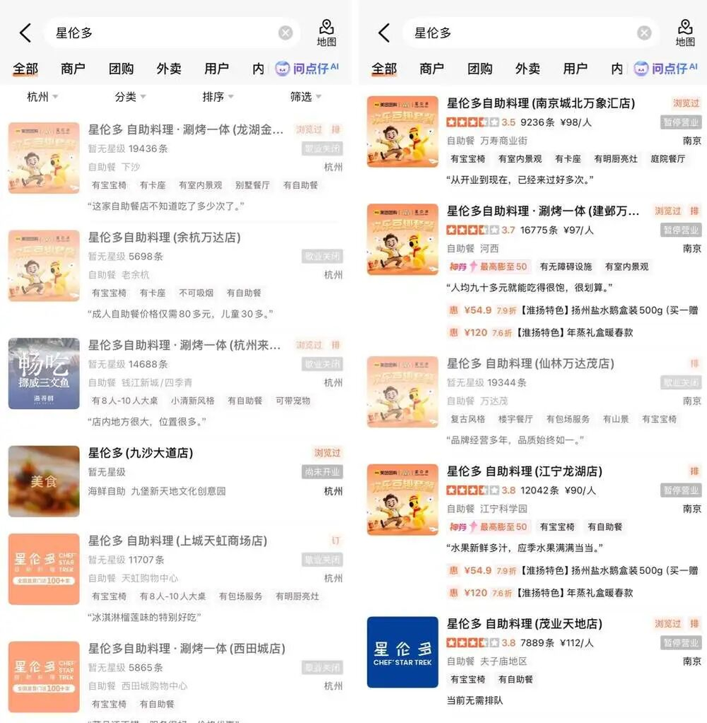 内参君查询大众点评发现,南京、杭州等城市的星伦多门店大片显示“暂停营业”,部分城市甚至出现全线闭店的情况。公开信息显示,目前该品牌门店数量约60家,今年一季度闭店超20家。