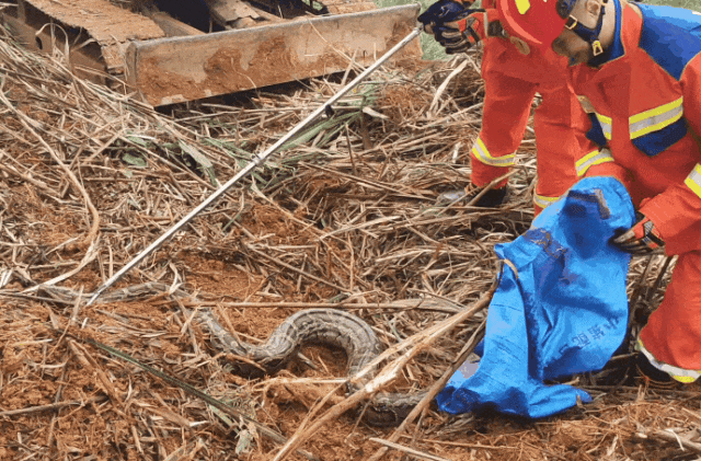 消防员到达后用捕蛇夹控制住蟒蛇