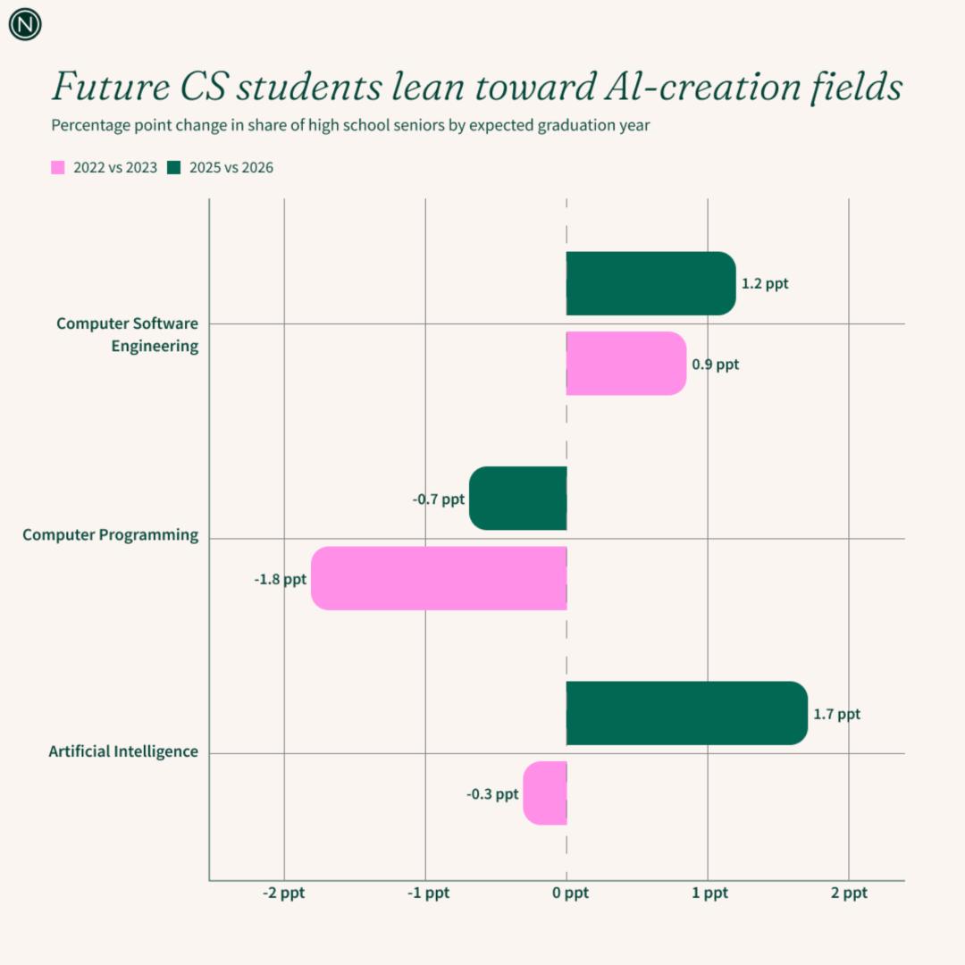 调查数据显示,对“传统编程”感兴趣的学生减少,但对“AI开发”和“软件工程”感兴趣的学生增加。学生们未集体逃离科技,而是在科技内部位移:从“易被替代的技能”转向“驾驭替代者的技能”。