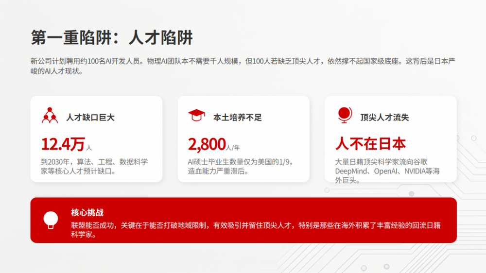 新公司计划聘用约100人,物理AI团队虽不需千人规模,但缺乏顶尖人才仍撑不起国家级底座。经济产业省数据显示,AI核心人才缺口约12.4万人,全产业链IT人才缺口达79万人。日本每年AI硕士毕业生仅约2800人,不及美国的1/9。更严重的是,大量日籍科学家在谷歌DeepMind、OpenAI、NVIDIA等海外企业,联盟能否吸引他们回流,仍是未知数。