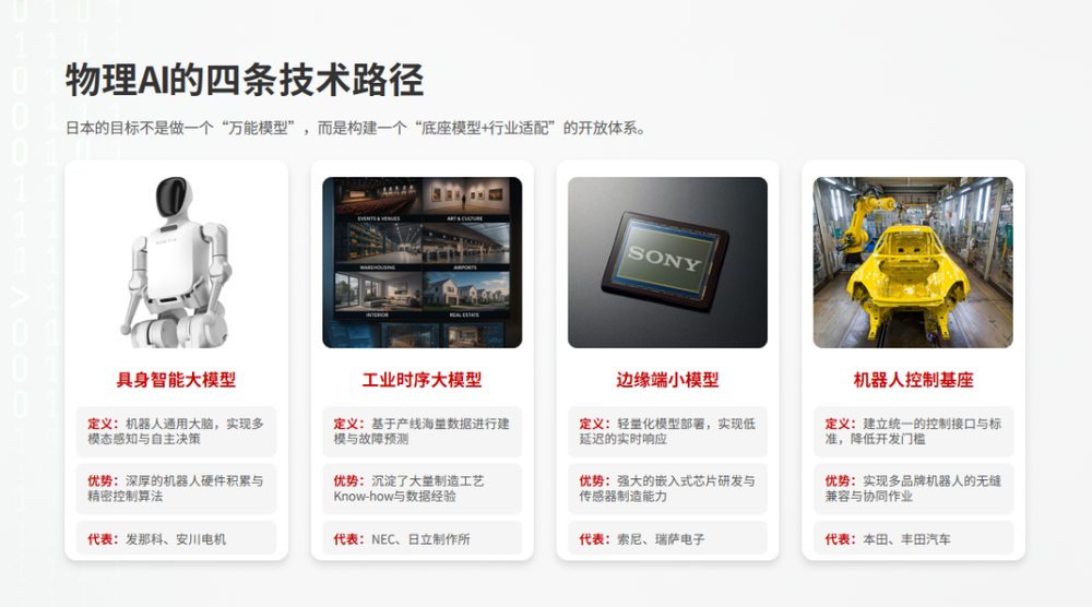 物理AI至少包含四条技术路径:具身智能大模型(机器人通用大脑)、工业时序大模型(产线数据建模预测)、边缘端小模型(实时响应低延迟)、机器人控制基座(统一控制接口)。日本的目标不是打造万能模型,而是构建“底座模型+行业适配”的开放体系,这比通用大模型更复杂,却更贴合日本实际需求。