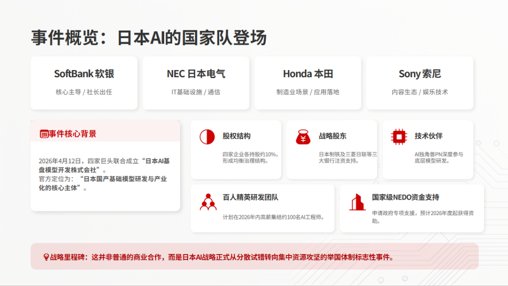 4月12日,软银、NEC、本田、索尼共同成立日本AI基盘模型开发公司,定位为日本国产基础模型研发与产业化的核心主体。四家企业各持股约10%,计划招募约100名AI开发人员,由软银高管担任社长。日本制铁以及三菱日联、三井住友、瑞穗三家大型银行作为少数股东参与投资。AI开发企业Preferred Networks也将参与技术研发。