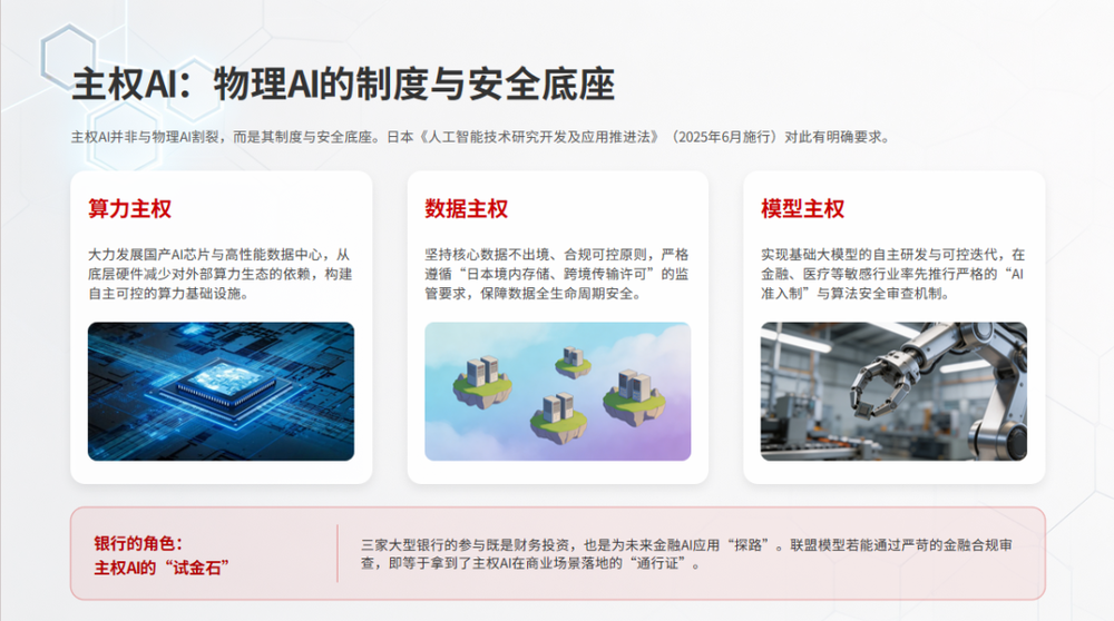 主权AI与物理AI并非割裂,而是物理AI的制度与安全底座。日本2025年6月施行的《人工智能技术研究开发及应用推进法》明确要求,基础模型需通过AI安全研究所合规评估,数据处理需遵循境内存储、跨境传输许可原则。联盟开发的模型需同时满足技术性能与主权合规要求,否则无法进入金融、政务等敏感行业。