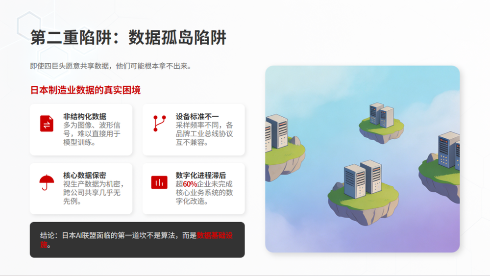 即使四巨头愿意共享数据,日本制造业数据仍面临困境:产线数据非结构化、设备采样频率不一、工业总线协议不兼容、企业视生产数据为核心机密。经济产业省调查显示,超60%的日本制造业企业尚未完成核心业务系统数字化改造。联盟面临的第一道坎不是算法,而是数据基础设施。
