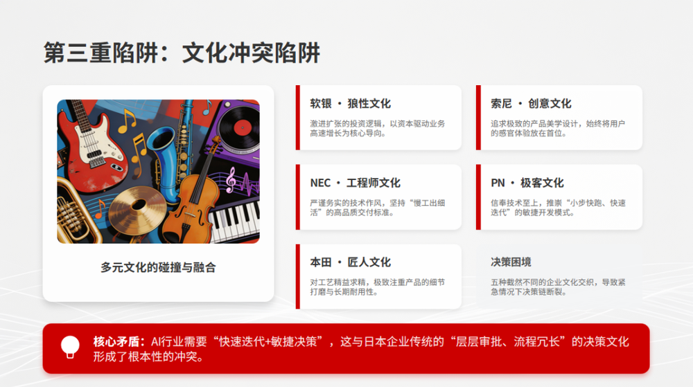 软银是狼性文化,NEC是工程师文化,本田是匠人文化,索尼是创意文化,PN是极客文化。五种文化交织,紧急情况下谁来决策?