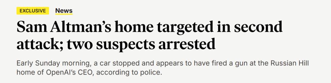 奥特曼住所发生第二起袭击事件,肇事者开枪后逃逸!作为AI浪潮核心人物,奥特曼的个人安全因行业争议与名声激增面临严峻挑战,AI末日论极端分子恐将制造更多危险事件。