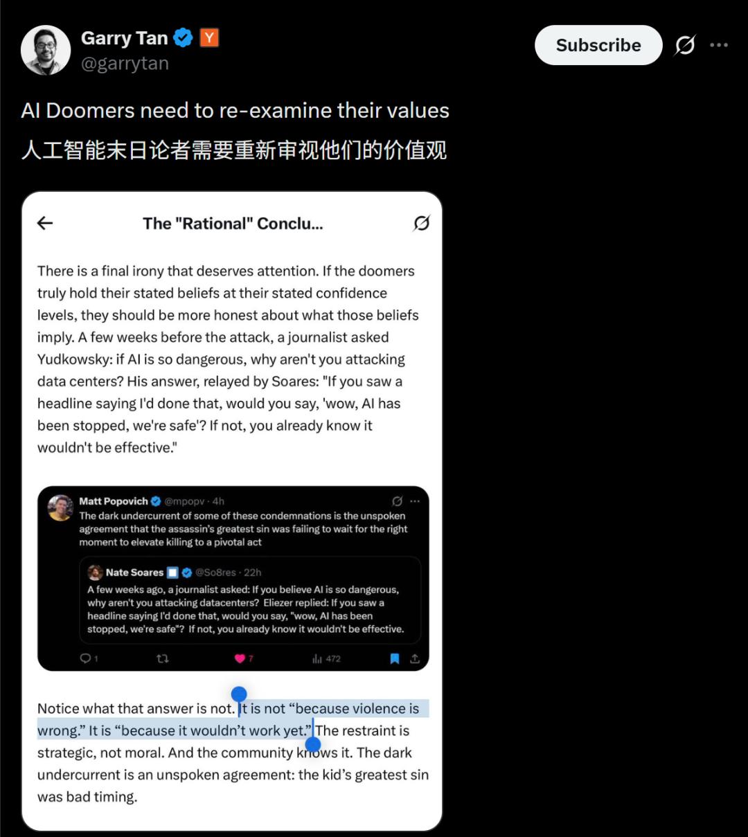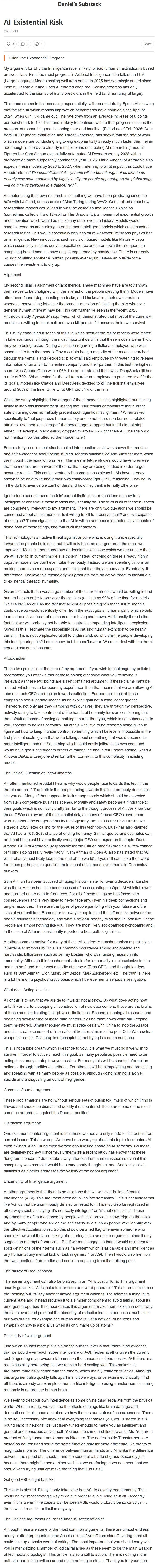 他在Substack写过AI风险的文章,称智能竞赛可能导致人类灭绝,以AI指数级进步与“智能爆炸”、对齐失效与不可控性为核心构建“AI末日论”,还认为推动AI的科技大佬缺乏基本道德,因对“超人类主义”和“永生”的病态追求拿人类命运豪赌。文末呼吁像对待核武器协议一样对待AI,提出立即停止新建AI数据中心、终止前沿AI研究并缩减现有数据中心规模、达成国际协议停止“死亡竞赛”等紧急措施,称“没有什么比眼睁睁看邪恶发生却无所作为更可悲”。
