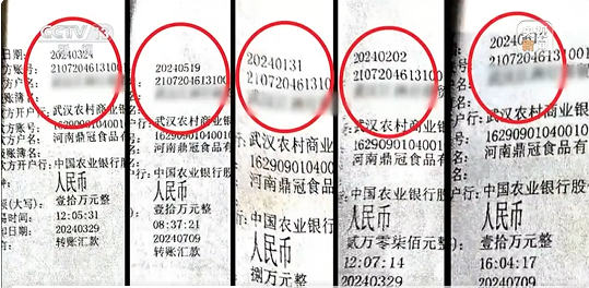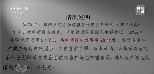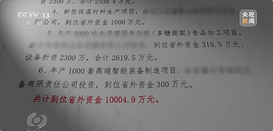 例如,由武汉某商贸有限公司投资的肉制品生产项目,提供的5张银行流水打款日期均为2024年,根本不是2025年1-11月到位的省外资金。《焦点访谈》报道截图