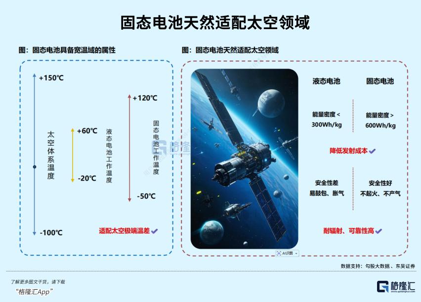 太空极端温差、强辐射的环境,液态电池根本无法适应,而固态电池凭借宽温域、高安全性和抗辐射特性,成为太空电源的理想选择,未来太空领域年需求有望达到几十甚至上百GWh。