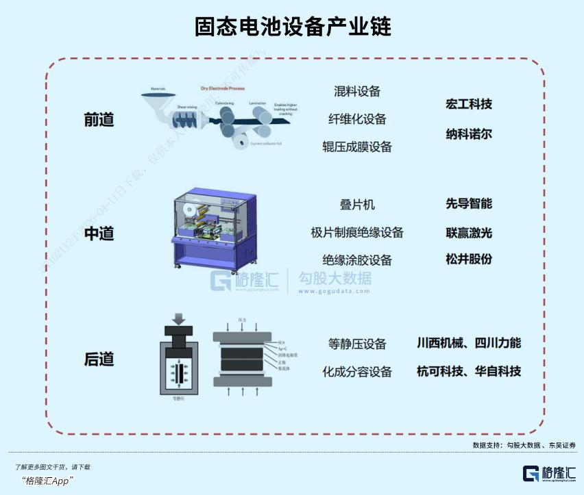 后段工艺的核心是高压化成分容,传统设备压力仅3-10吨,固态电池需要60-80吨才能实现界面致密化,目前只有杭可科技、先导智能和利元亨等少数企业具备量产能力。