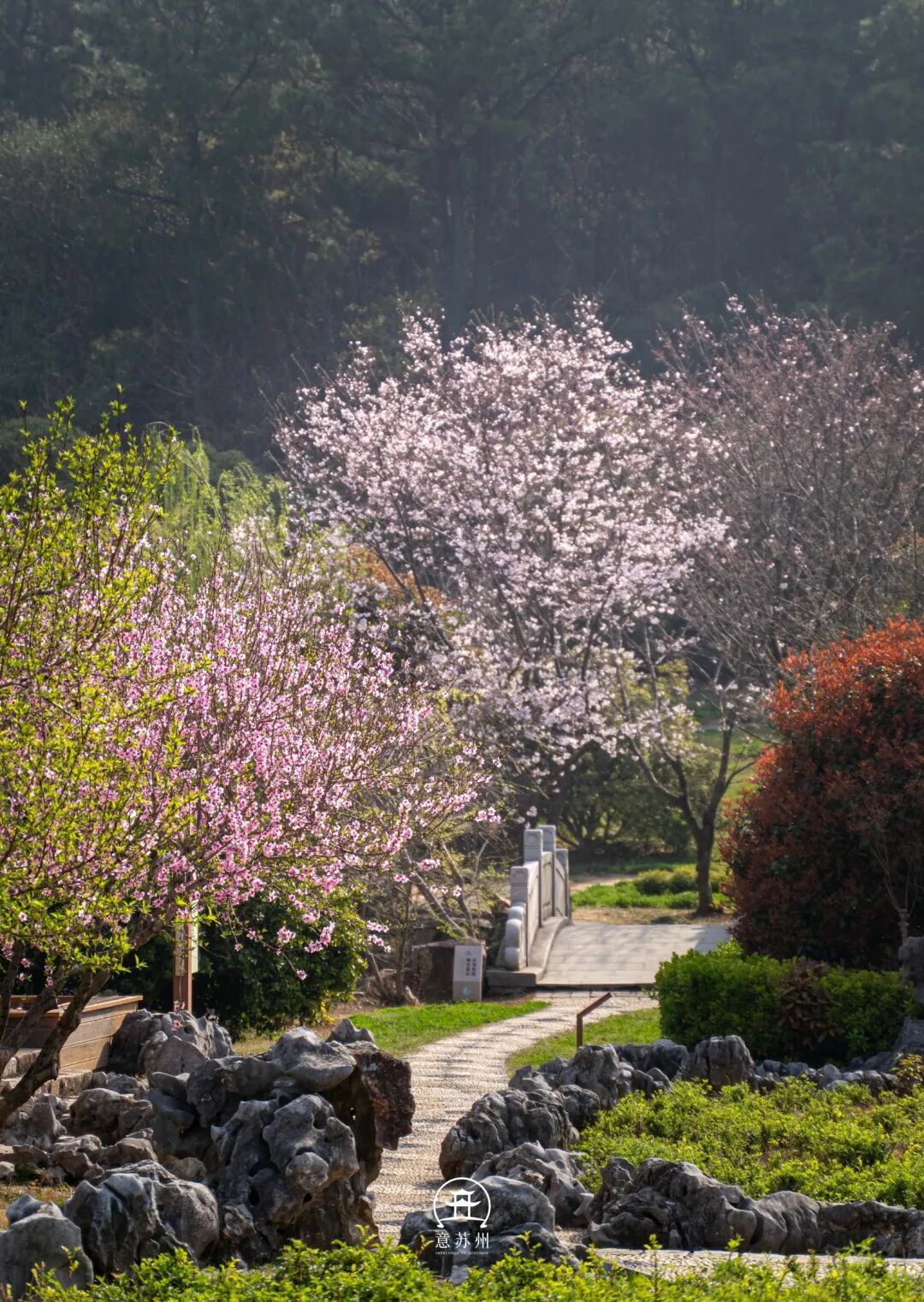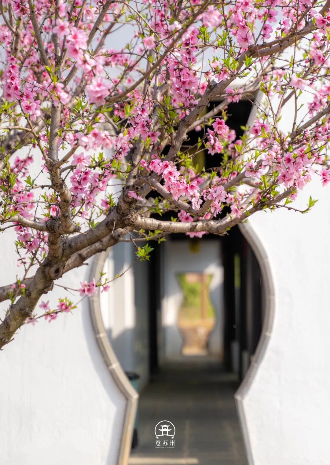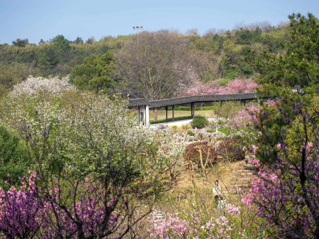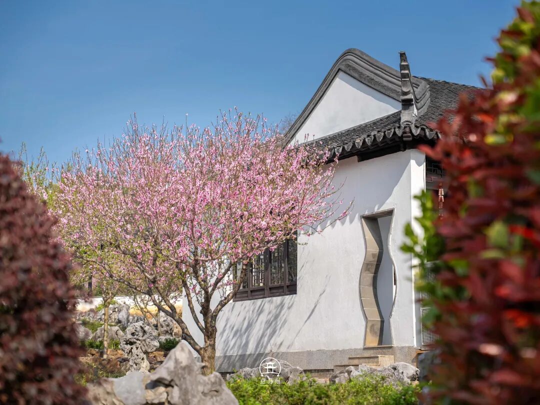 从园门进山,春日的仪式感便扑面而来。石阶旁的花枝探出头,粉红花影绕着白墙黛瓦的漏窗舒展,透过花窗望去,太湖的烟波与山间的桃林在蓝天下交织成景。沿着步道缓步上行,绿树成荫的林荫道上光影斑驳,脚下的落叶与身旁的新绿相映,时光仿佛在此刻慢了下来。