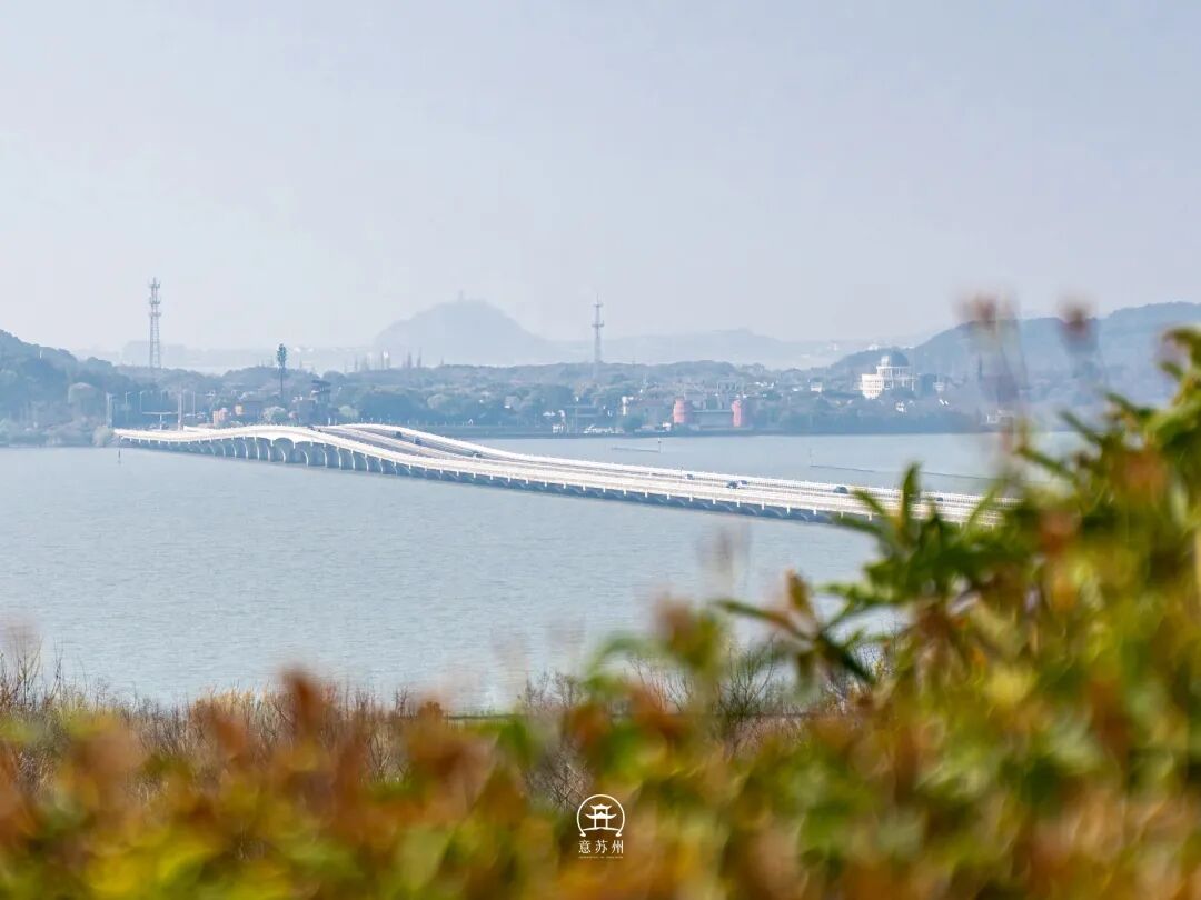 登高望远,更能体会渔洋山春日的壮阔。站在山巅远眺,太湖大桥如银带横跨湖面,万顷碧波在脚下舒展,远处的山峦与近处的桃林相映,湖光山色在眼前铺展成壮阔画卷。风掠过枝头,花瓣簌簌飘落,落在石阶、溪畔与太湖水面,把春日的温柔与鲜活,揉进了每一寸呼吸里。