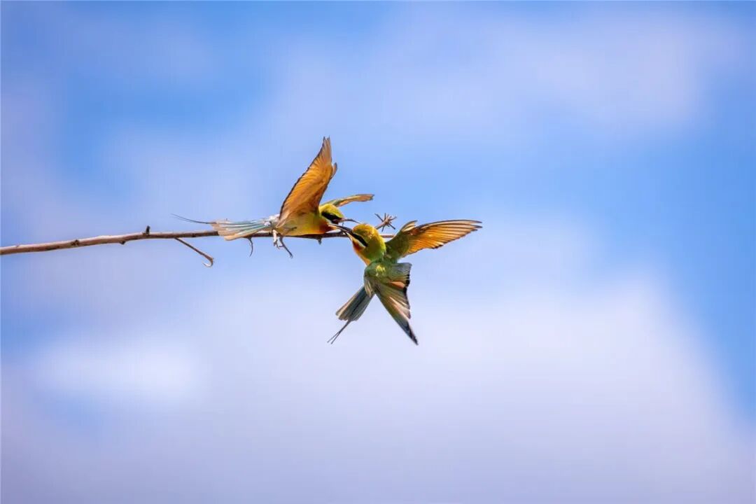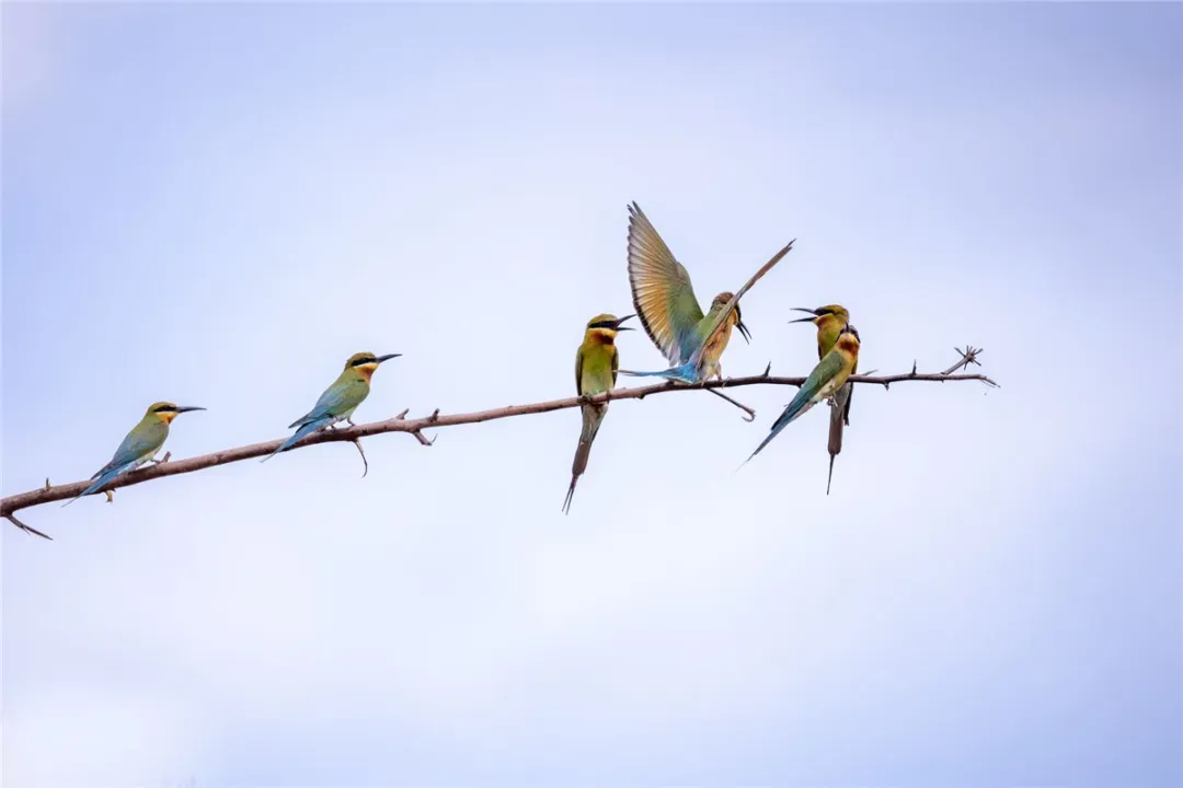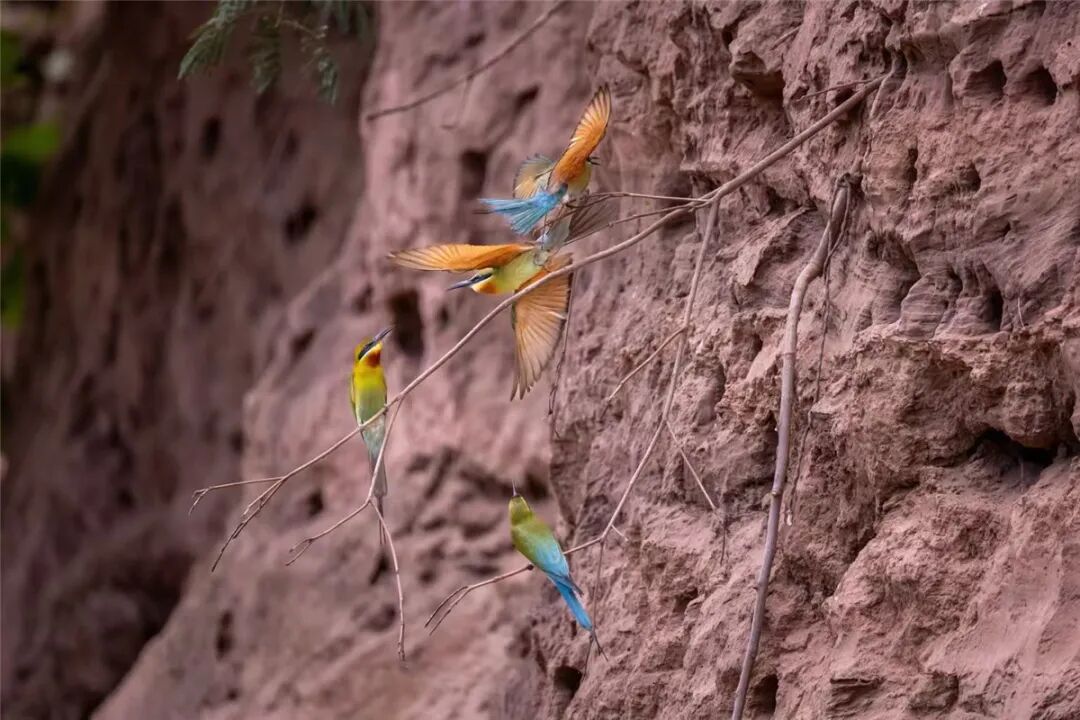 蜂虎鸟羽毛色彩斑斓,辨识度很高,擅长捕食蜜蜂、胡蜂、蜻蜓等昆虫。栗喉蜂虎、蓝喉蜂虎、绿喉蜂虎等都被列入国家重点保护野生动物名录,是名副其实的生态“明星物种”。