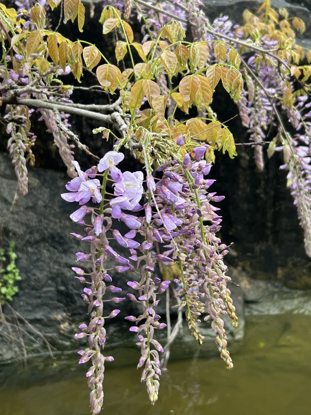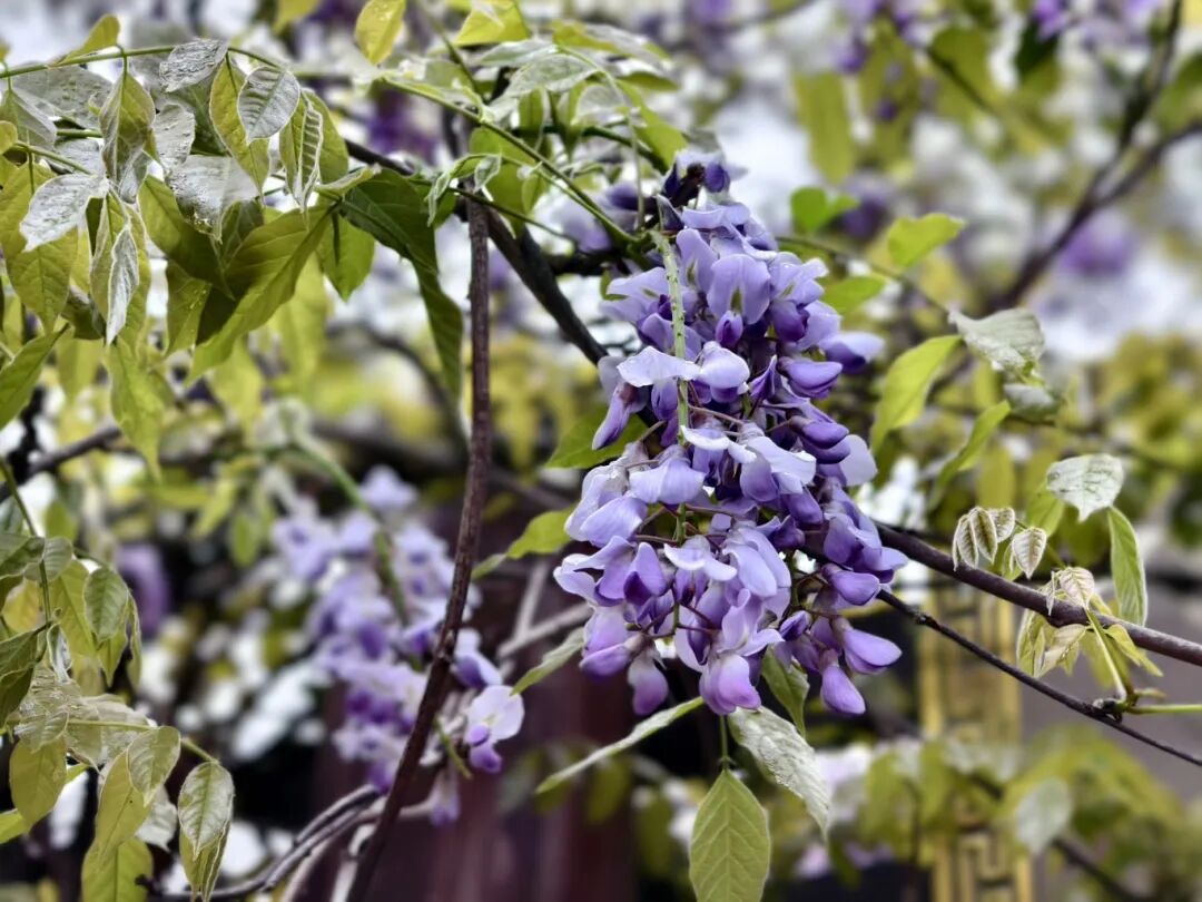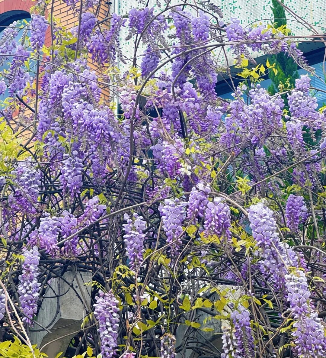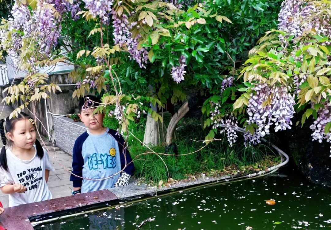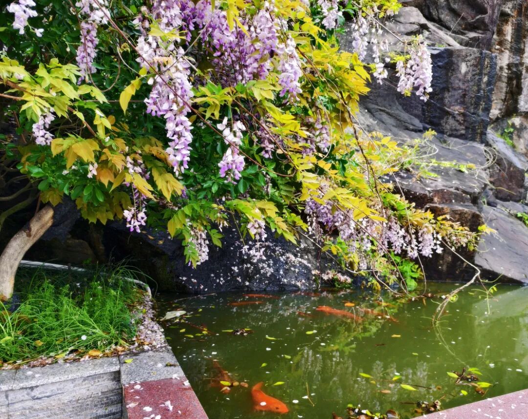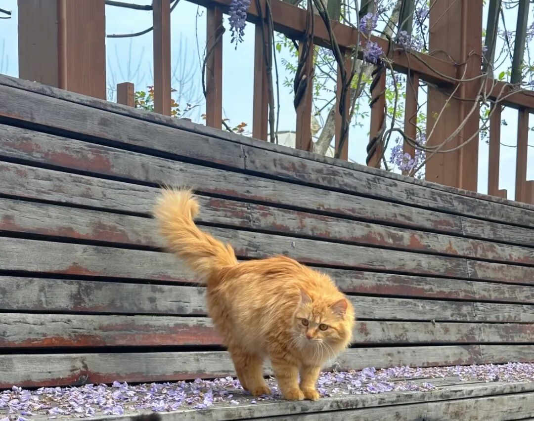 偶尔有猫咪轻盈走过铺满落瓣的围栏,