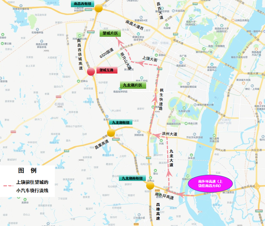 3. 上饶往南昌方向:南外环高速→九龙湖南枢纽→九龙湖枢纽→昌栗高速→西山枢纽→西山北互通→西山北收费站→G320国道→望城片区