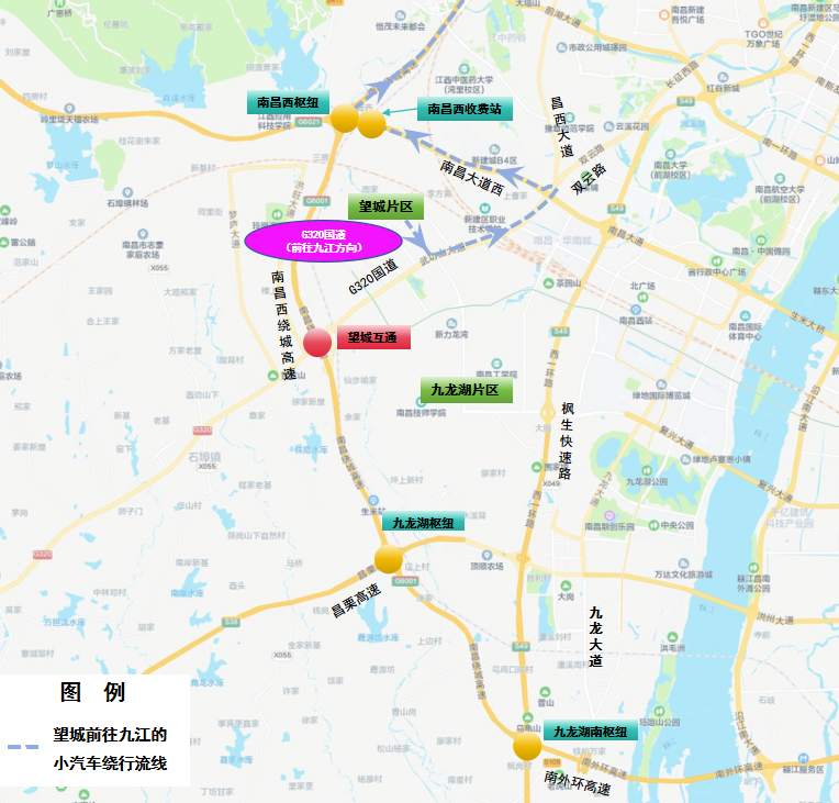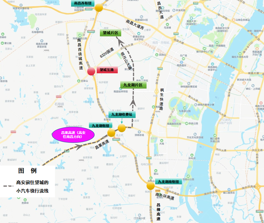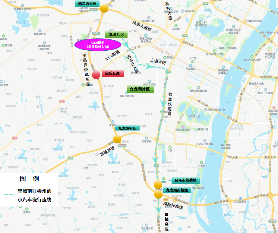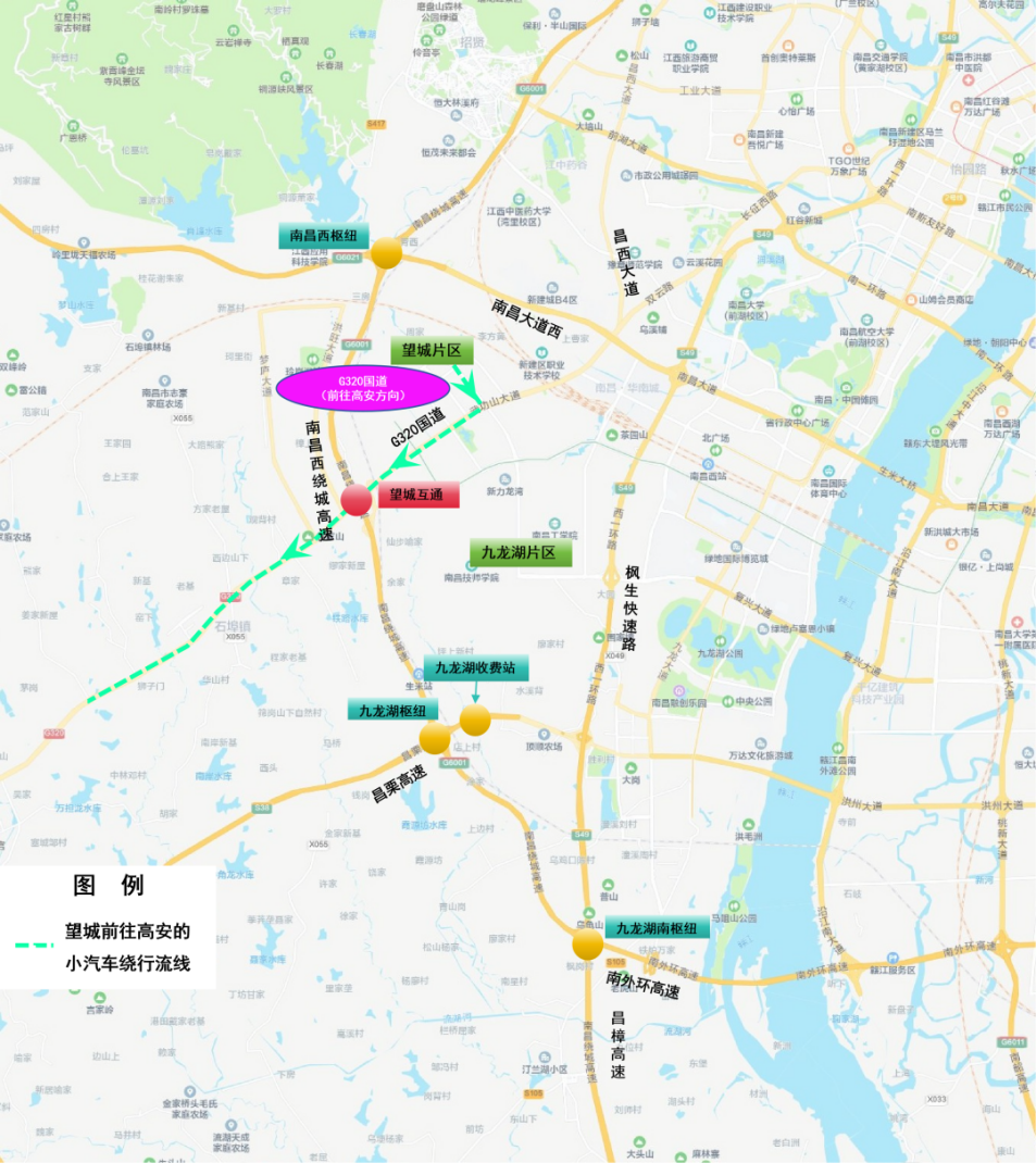 5. 高安往南昌方向:昌栗高速→西山枢纽→西山北互通→西山北收费站→G320国道→望城片区