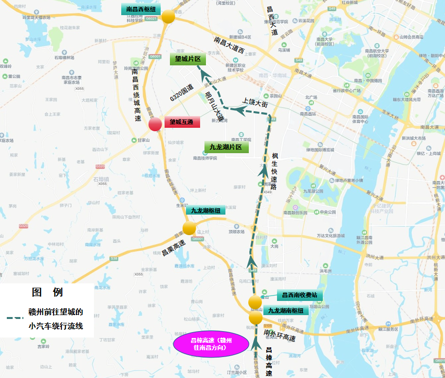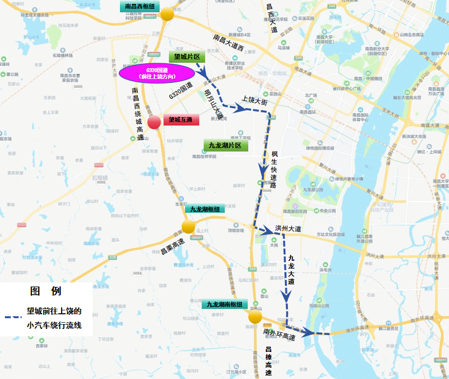 3. 南昌往上饶方向:G320国道→西山北收费站→西山北互通→西山枢纽→九龙湖枢纽→九龙湖南枢纽→九龙湖南收费站→南外环高速
