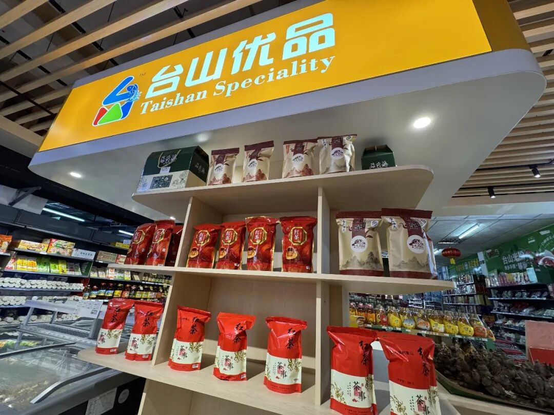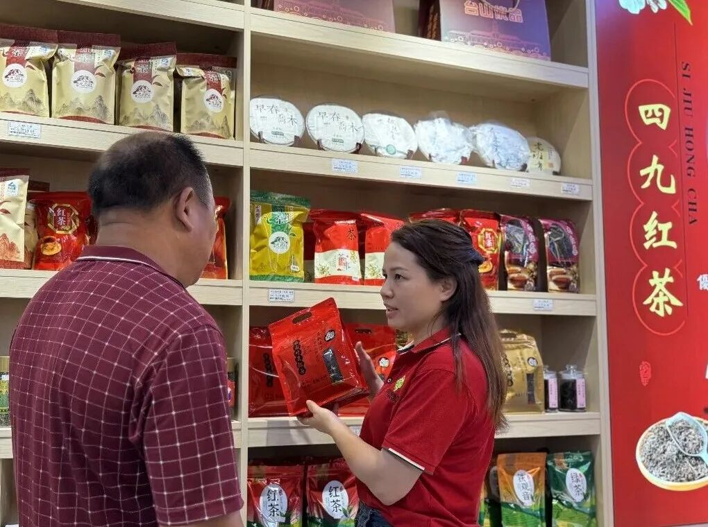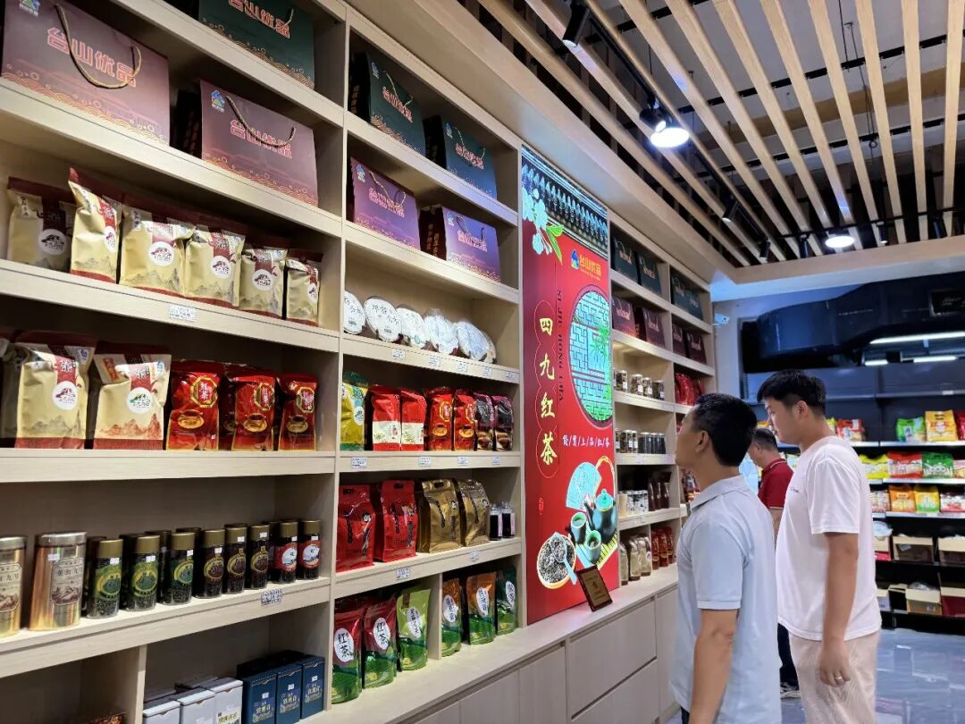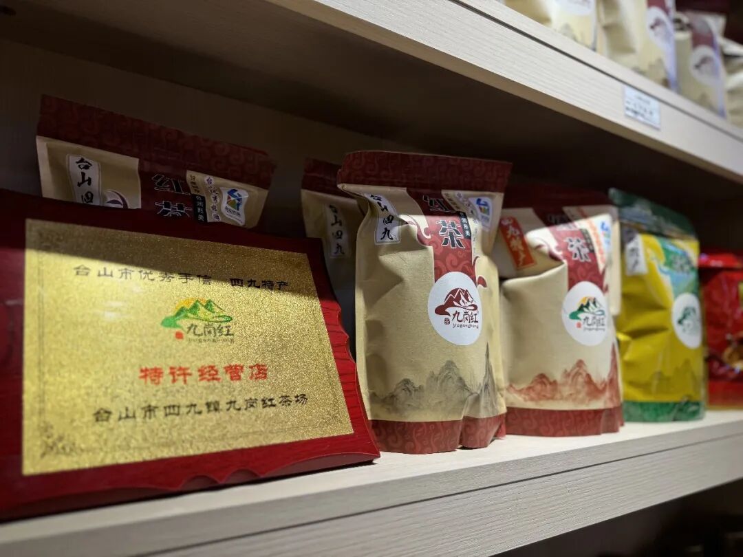 走进四九镇供销社“台山优品”销售点,醒目的“四九红茶”宣传展板十分显眼,展台上整齐摆放着不同品牌、商家推出的“四九红茶”产品。