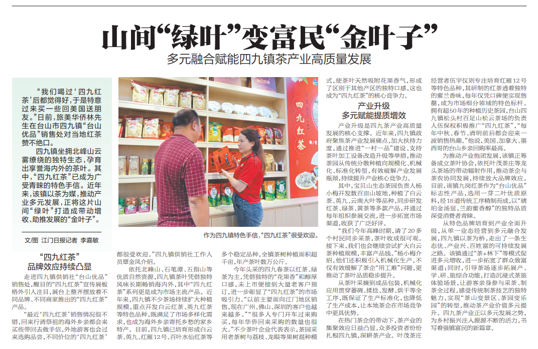 “喝了‘四九红茶’感觉特别好,特意来买些带回美国送朋友。”近日,旅美华侨林先生在台山市四九镇“台山优品”销售点,对当地红茶赞不绝口。