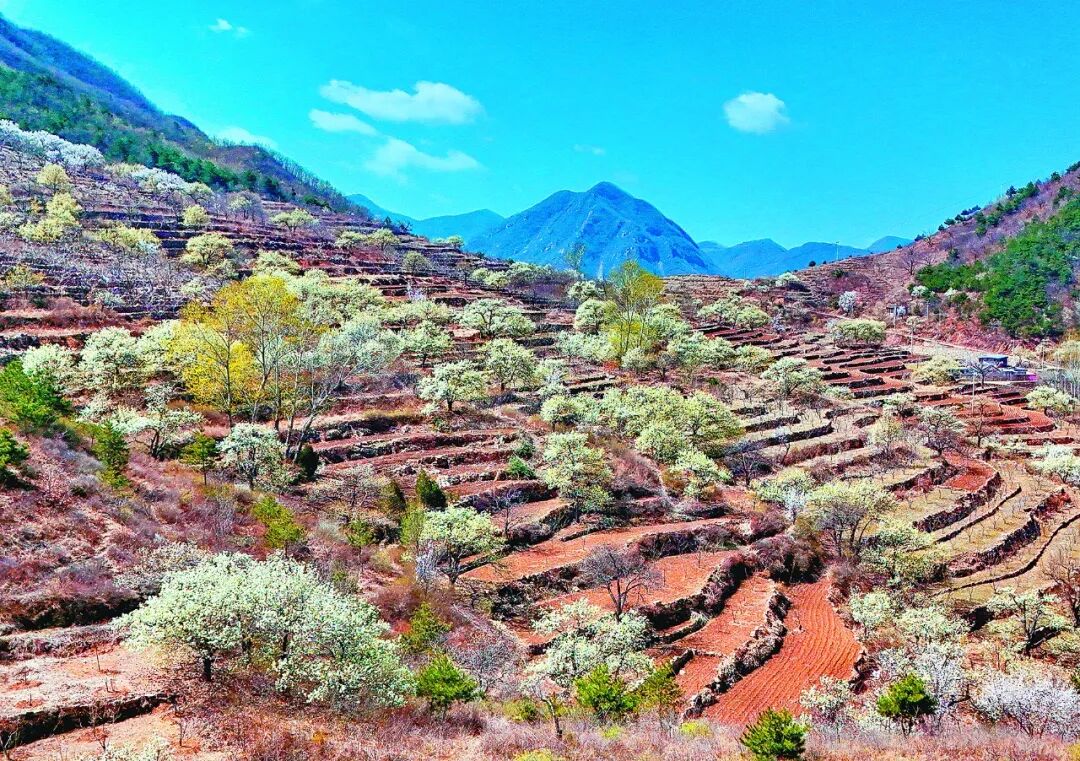 梯田上绽放的梨花与蜿蜒的明长城遗址相互映衬,吸引了大量游客前来踏春赏花、拍照打卡,共同赴约这场浪漫的春日盛会。记者 李铎 见习记者 陈立桐摄
