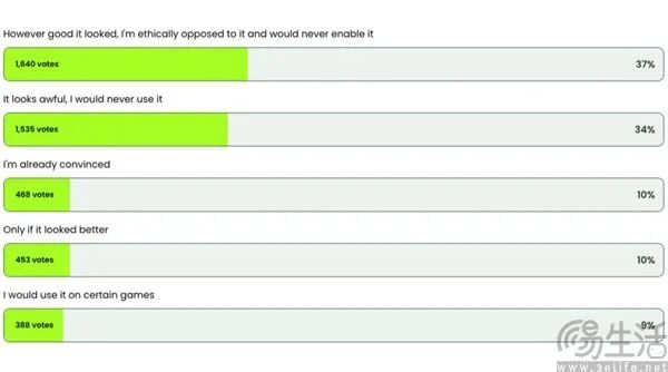 游戏媒体PC Gamer的问卷结果揭示了黄仁勋态度转变的原因:71%的玩家表示不会使用DLSS 5,其中37%明确从伦理层面抵制;仅10%的玩家准备在秋季上线时第一时间使用,9%会在特定游戏中选择性开启,剩余10%持观望态度。