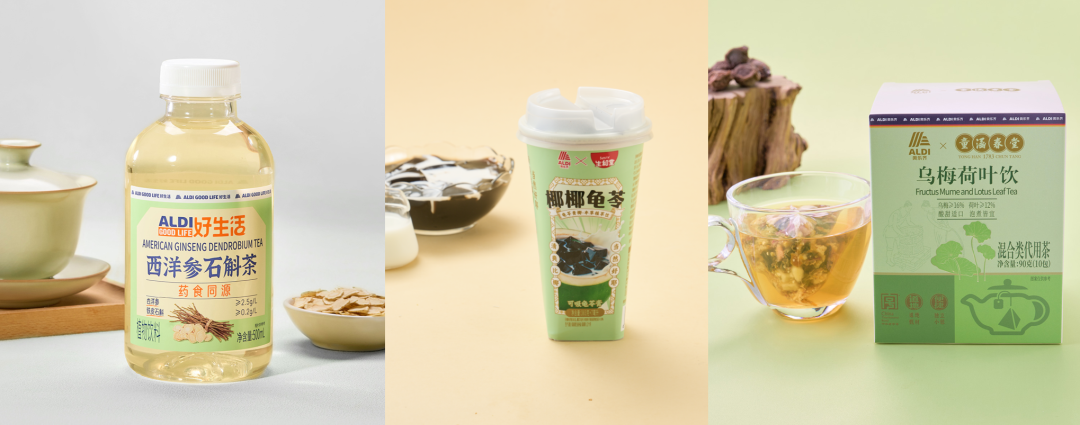 还有与老字号合作的健康饮品,如390克仅售6.5元的奥乐齐x生和堂龟苓膏植萃饮、9克*10袋装仅售16.9元的ALDIx童涵春堂乌梅荷叶饮。