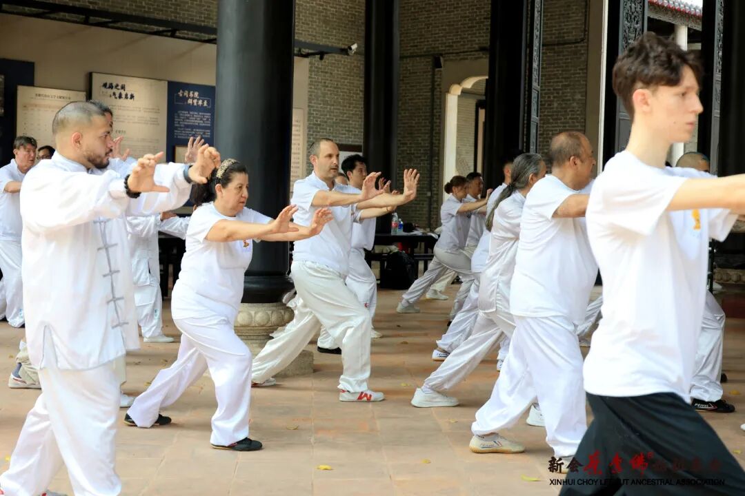 新会书院内,60名海外弟子身着统一的中华武术传统服饰,整齐列队,在教练的带领下练习蔡李佛气功。一呼一吸间,动作刚柔相济,拳风凌厉,脚步沉稳,古老书院的青砖灰瓦与武术弟子的矫健身姿相互映衬,构成一幅传统与活力交织的画面。